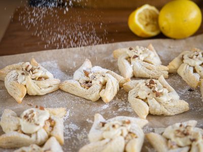 Mantelilla täytetyt ja sitruunatuorejuustolla kuorrutetut joulutortut
