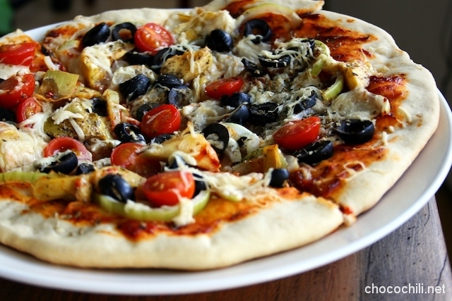 Ja sitten se juusto. Olen kokeillut erilaisia oluthiivahiutale- ja kaurakermavirityksiä, mutta mielestäni paras ratkaisu on ostaa kaupasta paketillinen soijapohjaista Cheezly Mozzarellaa. Jos (ja kun) käyttää hyviä täytteitä, ei kannata liioitella juuston kanssa, ettei kaikki ihanat maut peity rasvakerroksen alle.