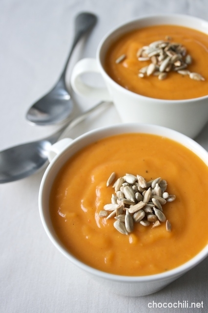 - Mausta ja anna vielä kiehahtaa. Koristele annokset paahdetuilla auringonkukansiemenillä tai tuoreella korianterilla.