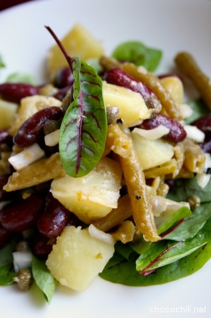Tämä resepti on kulkenut perhepiirissäni jo vuosikaudet. Salaatti on paitsi mainio lounasruoka, myös loistavaa syötävää noutopöytään tai piknikille. Tämä on todella täyttävää ja maistuu yleensä kaikille pahimpia papufoobikoita lukuun ottamatta.