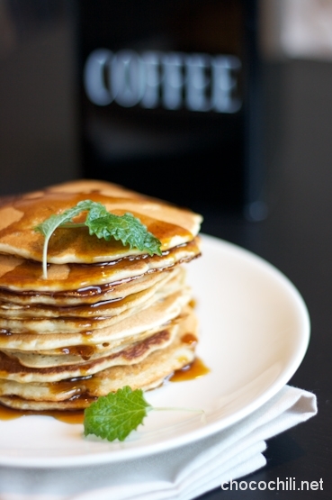 Olen aina ollut aamuihmisiä ja erityisesti sunnuntaiaamut on parhaita hetkiä viikossa. Arkiaamuina syön aamupalaksi yleensä leipää tai mysliä ja soijajogurttia, mutta vapaapäivinä voi vähän puuhastella aamupalansa eteen. Pannukakkujen tekeminen ei ole vaikeaa ja ne onnistuvat hyvin vaikka silmät puoliummessa. Amerikkalaiset pannukakut maistuvat parhailta vaahterasiirapin ja tuoreiden marjojen kera. Minulla ei tosin tällä kertaa ollut kotona sen kummemmin vaahterasiirappia kuin marjojakaan, joten tavallinen siirappi toimitti makeuttajan virkaa. Tavallinen siirappi näyttää kyllä kuvissakin paremmalta, koska se ei vaahterasiirapin tavoin valahda sekunnissa lautaselle.