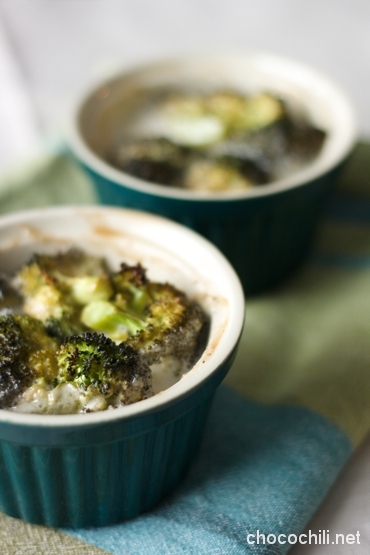 - Kokoa parsakaalit pieniin annosvuokiin ja kaada päälle kookosmaitoseos.