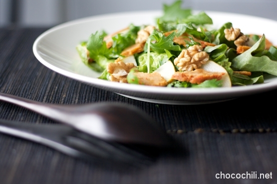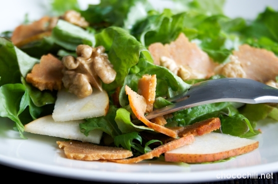 En saanut jouluna seitanpaistista tarpeekseni, joten ajattelin tällä kertaa jalostaa herkun salaatin kylkiäiseksi. Saksanpähkinät, päärynä ja aavistuksen savulta maistuva seitan toimivat loistavasti yhdessä! Hyviä aineksia ei kannata hukuttaa kastikkeen alle, joten kyytipojaksi ei tarvita muuta kuin saksanpähkinäöljyä ja hyvää viinietikkaa.