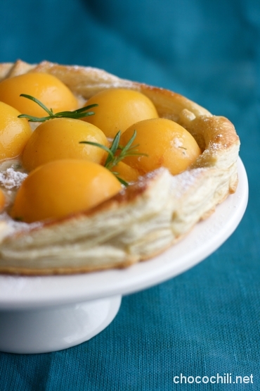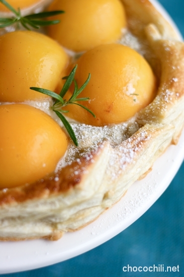 Ohje on peräisin Glorian Ruoka & Viini -lehden numerosta 2/2009, mutta muuntelin sitä vähän omaan keittiööni sopivammaksi. Alkuperäisessä ohjeessa oli käytetty säilykeaprikooseja, mutta käytin persikoita, koska en onnistunut löytämään aprikooseja mistään. Rosmariini oli muuten jännä lisä piiraan makumaailmaan – se ei maistunut kovin voimakkaasti, mutta toi mukavan vivahteen manteliselle täytteelle.