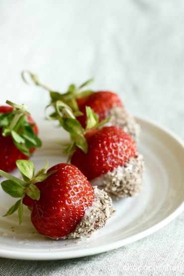 - Dippaa mansikat ensin valkosuklaaseen ja pyöritä sitten Mariannerouheessa.