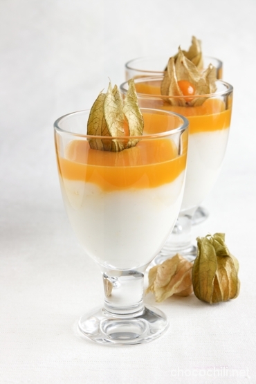 - Valmista kiille, kun pannacotat ovat jäähtyneet läpikotaisin: kiehauta kattilassa mangomehu ja lisää sokeri pikkuhiljaa koko ajan sekoittaen. Anna kiehua vielä 1-2 minuuttia. Kaada varovasti pannacottien päälle ja siirrä taas jääkaappiin.