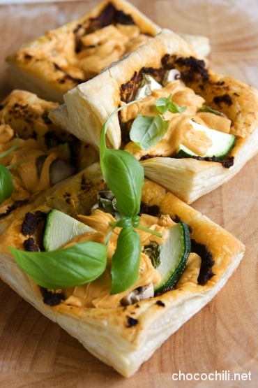 Viipaloi kesäkurpitsa ja sienet ja levitä ne neliöiden päälle.