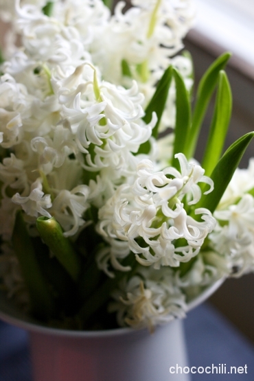Jos joulu ei tule ilman riisipuuroa, niin ei myöskään ilman hyasintteja ja niiden tuoksua. Valkoiset leikkohyasintit ovat löytäneet paikkansa keittiön pöydältä.
