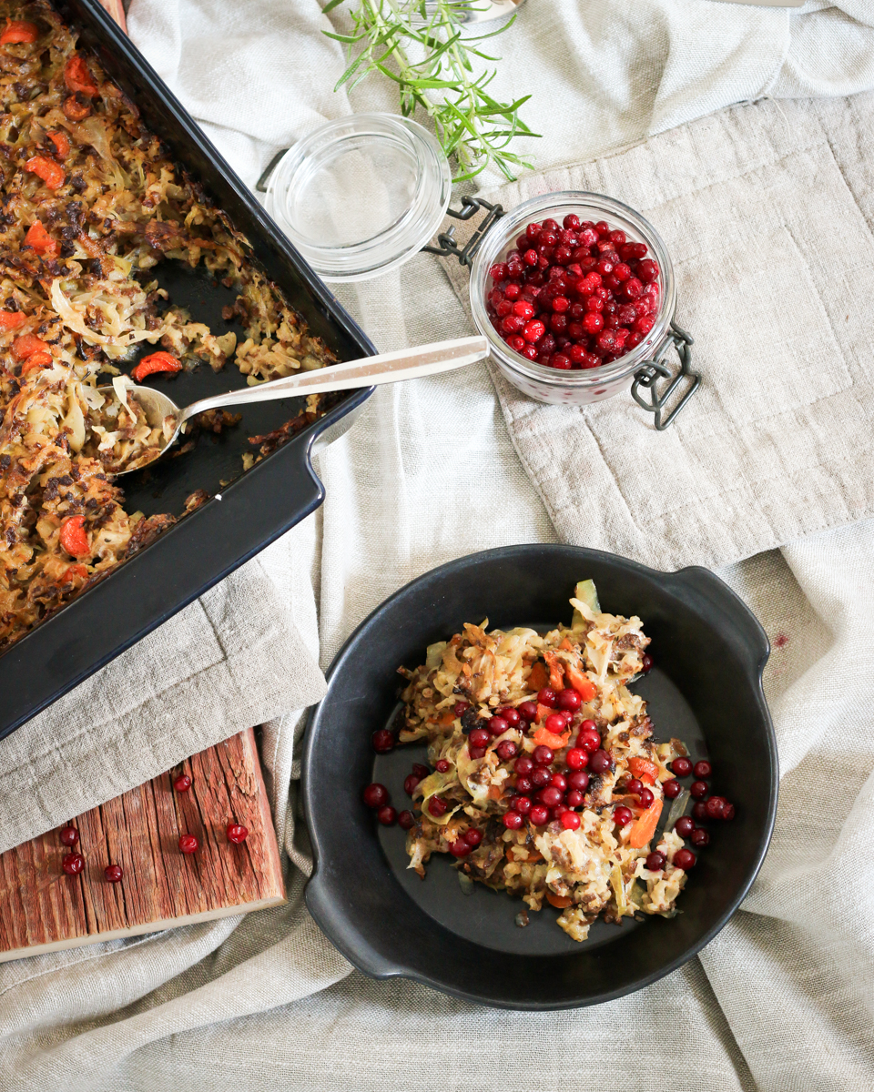 Marraskuussa jos milloin kaipaan ruokalistalleni lohturuokaa. Ja ainakin minulle erilaiset lapsuudesta tutut uuniruoat ovat sitä parhaimmillaan. Sunnuntaina päätin ryhtyä kaalilaatikontekopuuhiin, kun löysin jääkaapista notkumasta yhden yksinäisen kaalinpään. Helppo kaalilaatikon vegaaniversio tehdään soijarouheesta ja sekaan lorautetaan vielä tölkillinen kaurakermaa tuomaan ekstramehevyyttä.