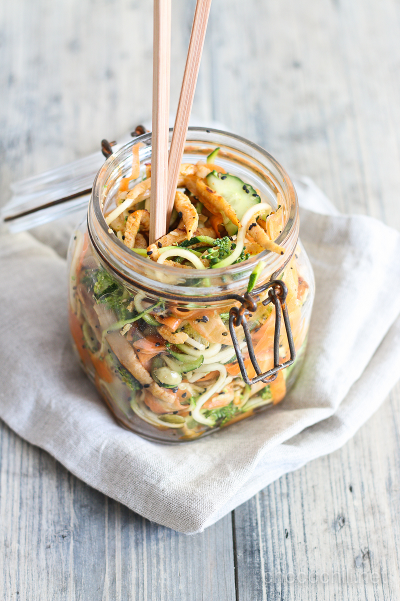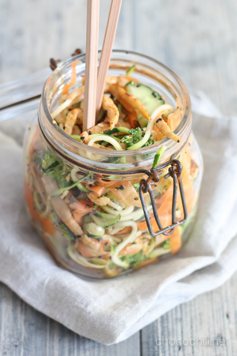 Kesäkurpitsanuudeleita ja soijasuikaleita sweet chili -kastikkeella. Oivaa lounasruokaa!