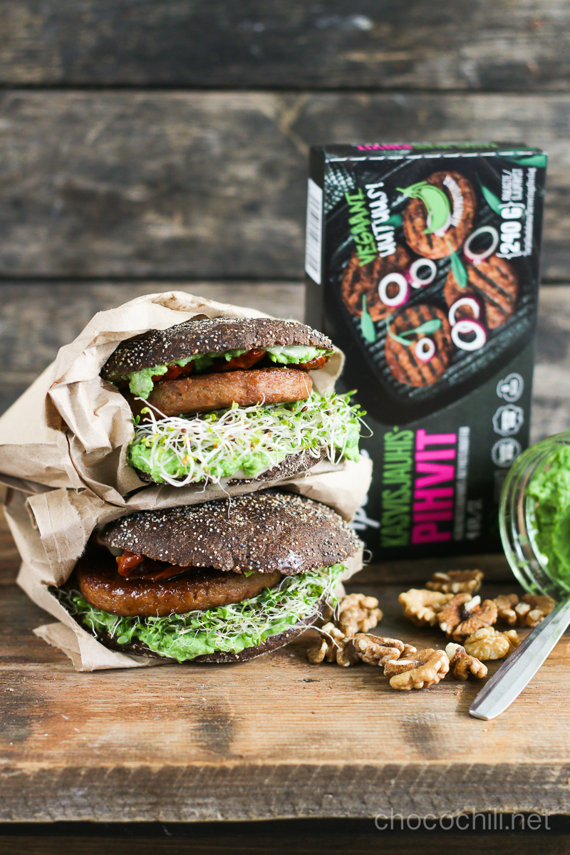 Apetitin kasvisjauhispihvit ovat mainioita burgereiden ja eväsleipien välissä. Nappasin itse tämän avokado-hernetahnalla, aurinkokuivatuilla tomaateilla, iduilla ja saksanpähkinöillä täytetyn leivän töihin evääksi ja se toimi hyvin myös kylmänä. Reseptistä saa muuten näppärästi triplaherneburgerin lisäämällä väliin vielä tuoreita herneenversoja :)