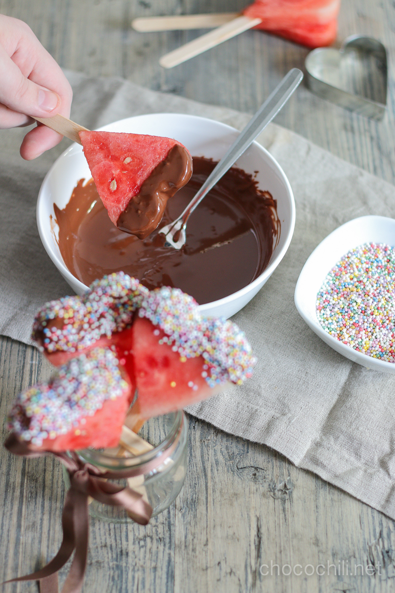 - Kuivaa vesimelonisydämet kevyesti talouspaperilla. Dippaa sydämet ensin suklaaseen, sitten nonparelleihin.