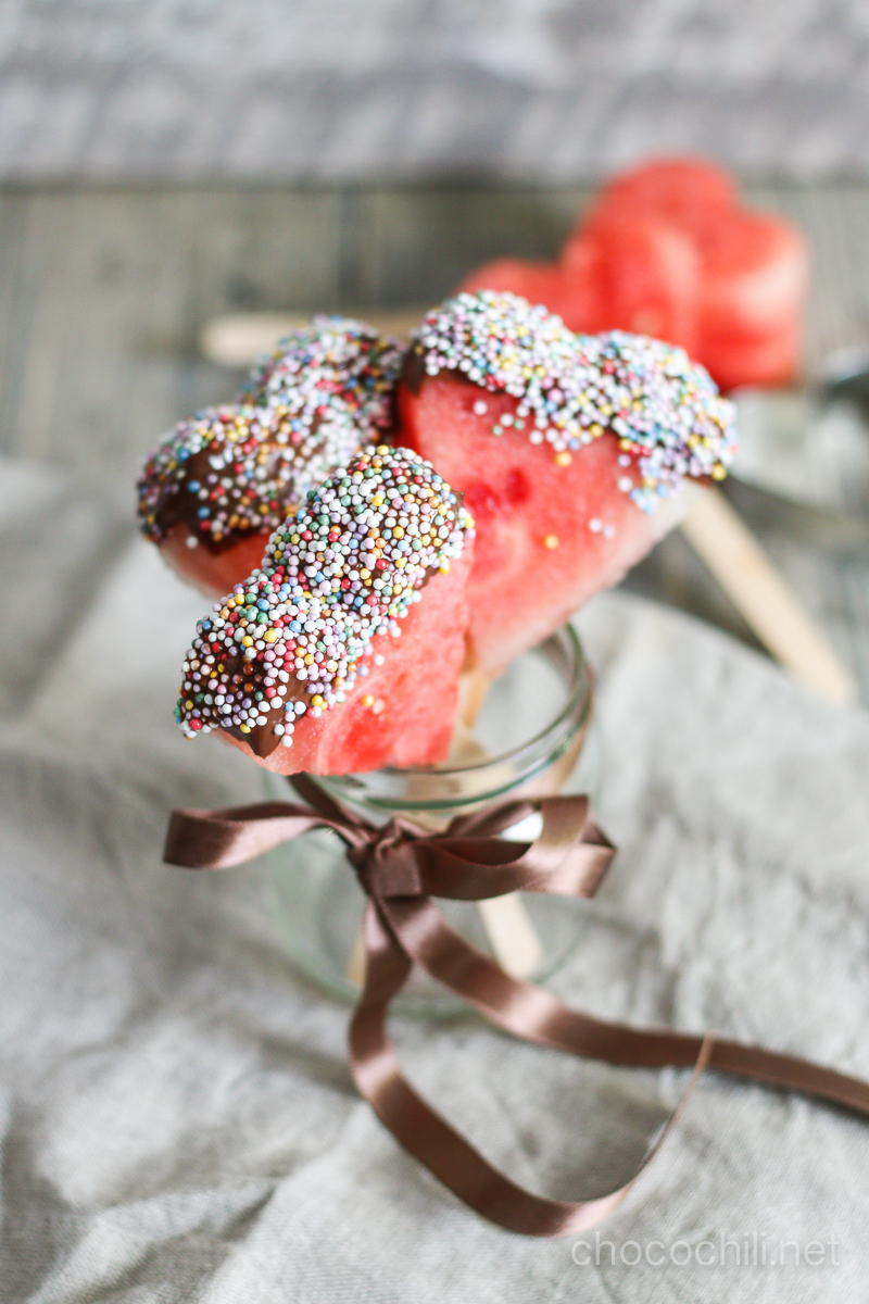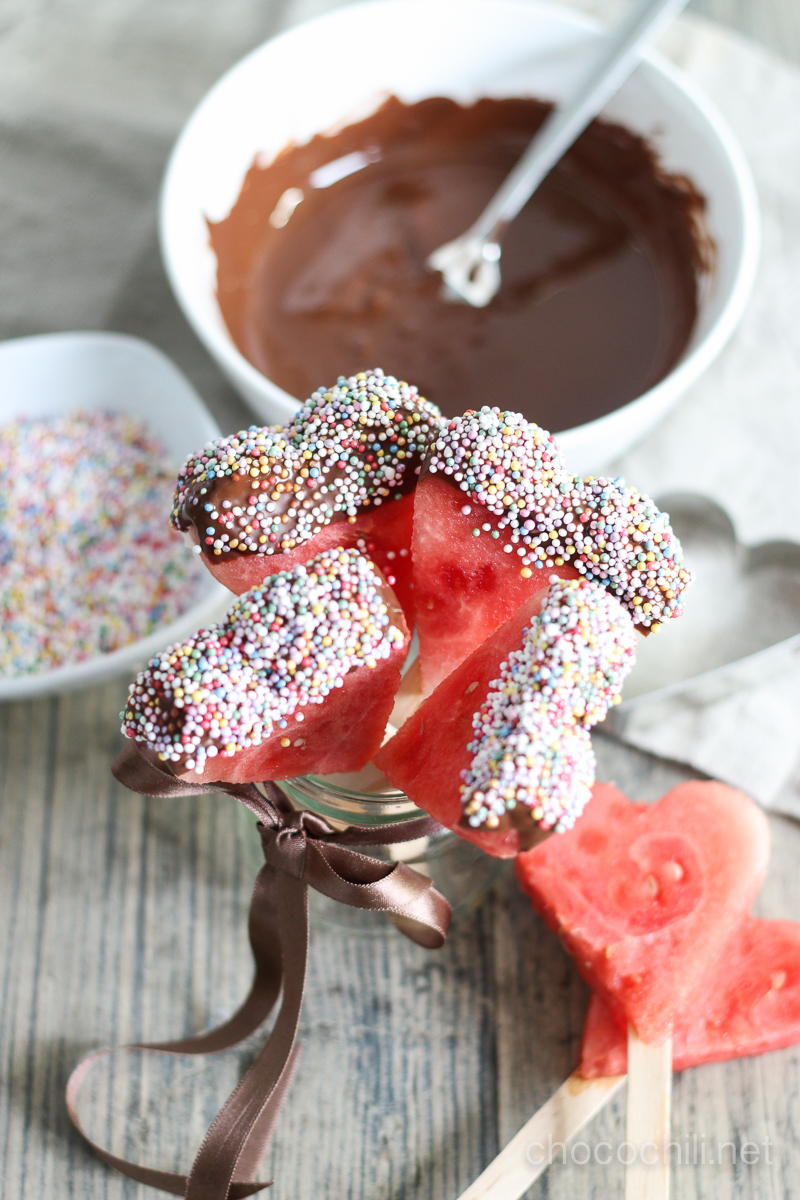 Sydämenmuotoiset, suklaaseen ja nonparelleihin dipatut vesimelonitikkarit ystävänpäiväksi <3