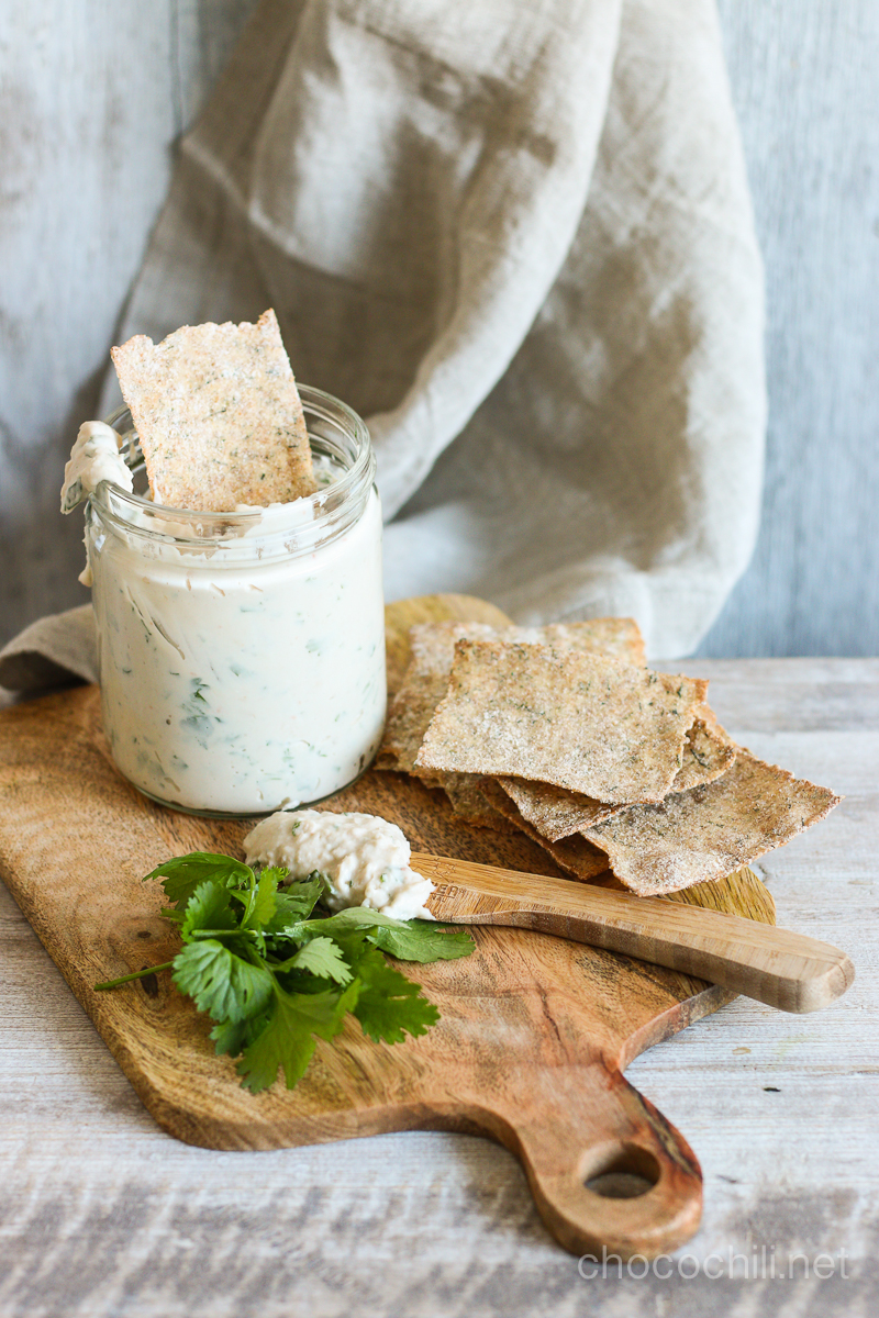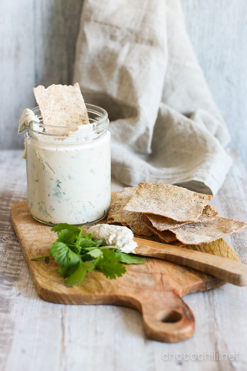 Anoppi piipahti meillä kylässä viikon puolivälissä ja toi mukanaan pari pussillista itse tehtyjä näkkäreitä. Niille piti tietysti saada joku hyvä levite. Oli tarkoitus tehdä hummusta, mutta kaapista löytyikin kikherneiden sijaan valkoisia papuja ja lopulta tahnan sekaan päätyi vielä pöydänreunalla notkunut korianteripuska. Näistä aineksista syntyi varsin kelpo levite!
