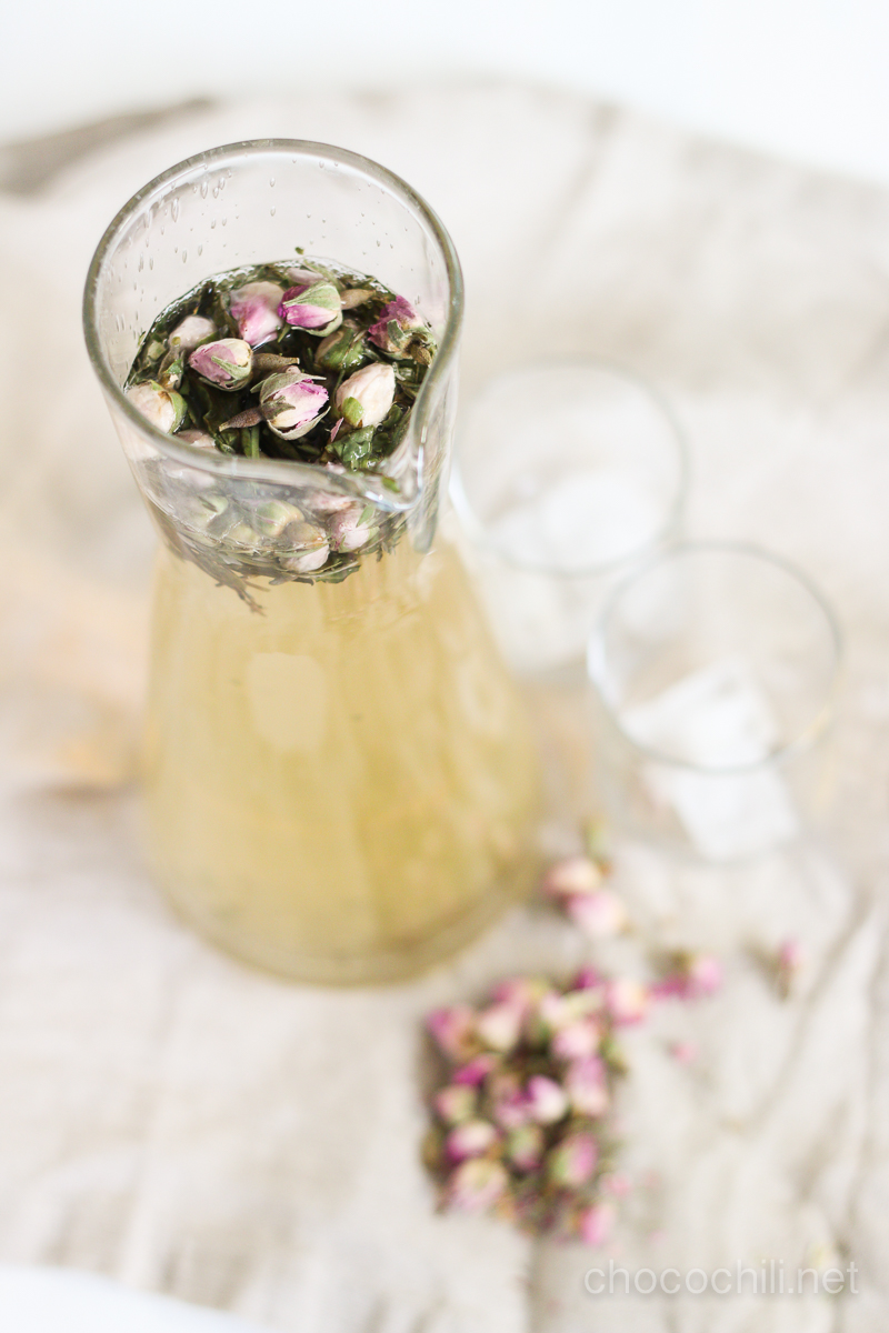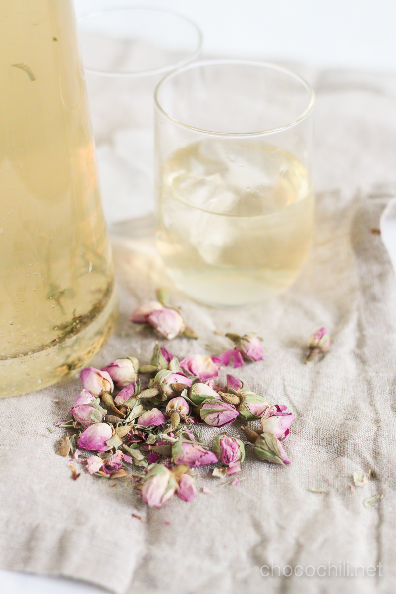 Tällä kertaa hauduttelin jääteen valkoisesta teestä ja ruusunnupuista. Teen voi jättää yöksi hautumaan jääkaappiin kylmään veteen ja se on valmista seuraavana aamuna. Kylmässä vedessä uutettu tee ei muutu kitkeräksi, joten kylmäuuttaminen sopii erityisen hyvin jääteen valmistusmenetelmäksi.