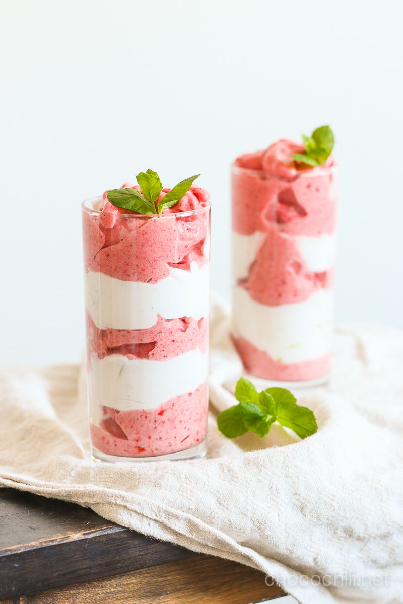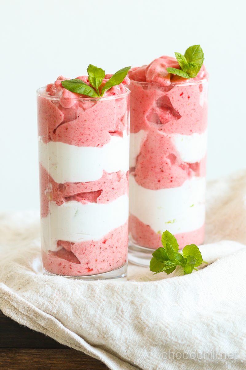 Lime-kookoskermaa ja mansikkanicecreamia kerroksittain, nam!