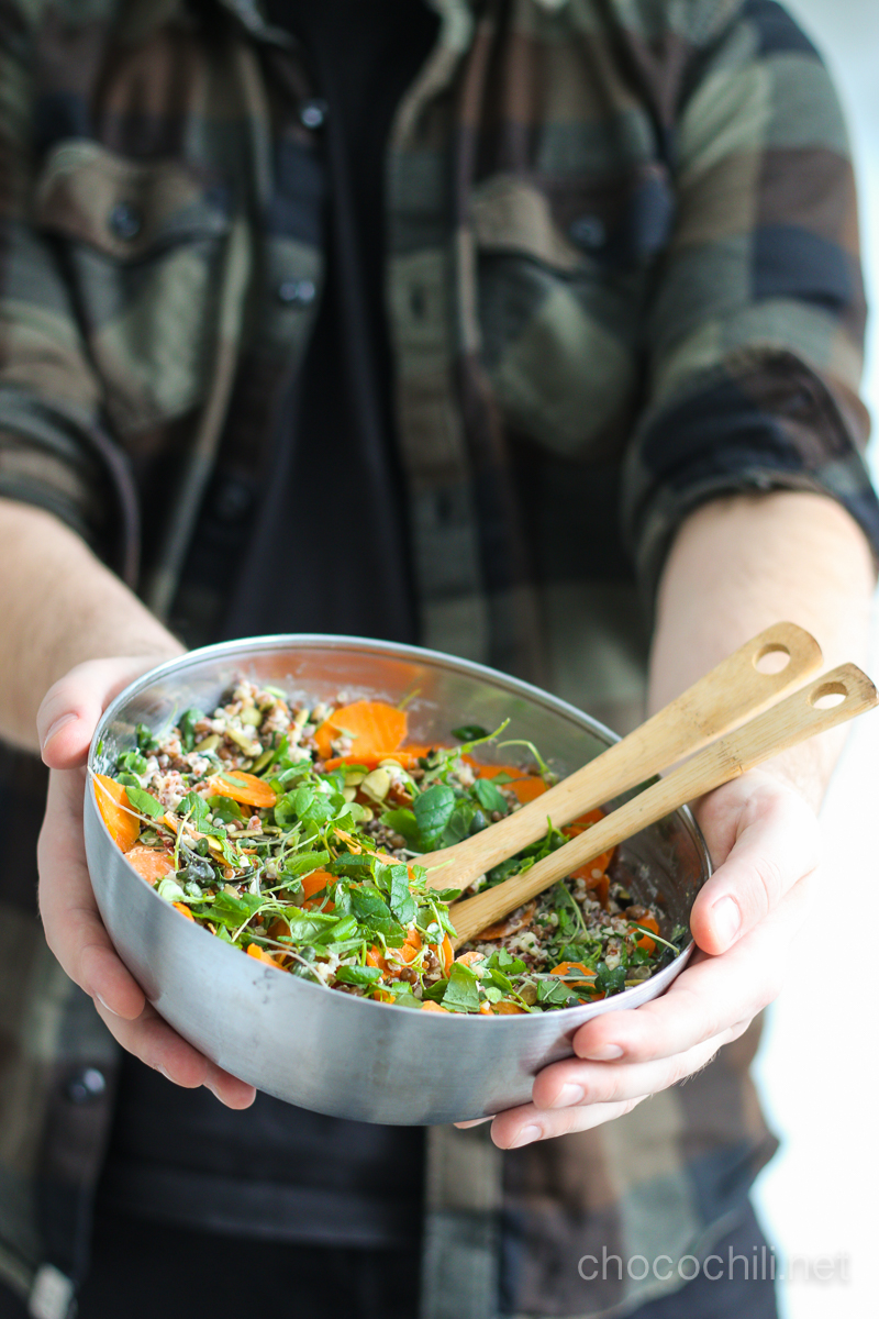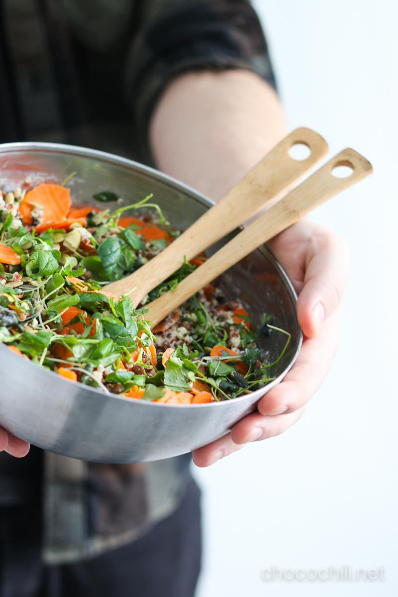 - Kuori porkkanat ja leikkaa ne ohuiksi ”kolikoiksi” esimerkiksi kuorimaveitsen avulla. Silppua yrtit. Sekoita porkkanat, versot, yrttisilppu ja kurpitsansiemenet kvinoan sekaan. Tarkista suola.