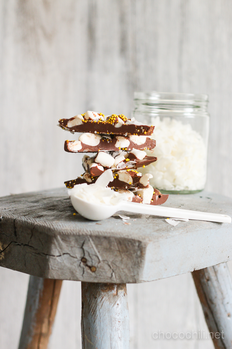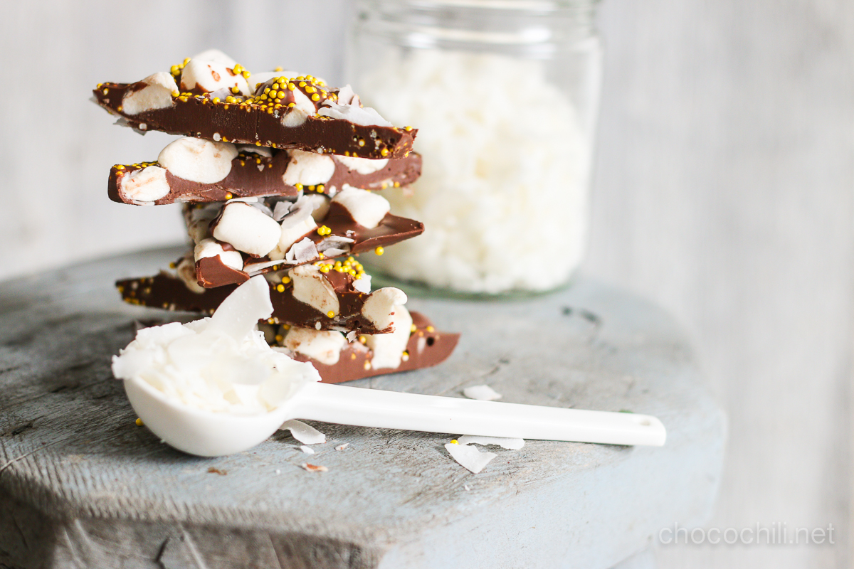 - Laita leivinpaperi pienehkön piirasvuoan tai lautasen pohjalle. Ripottele pohjalle hieman kookoslastuja ja nonparelleja. Kaada päälle sula suklaa ja lisää pinnalle vaahtokarkit sekä loput kookoslastuista ja nonparelleista.