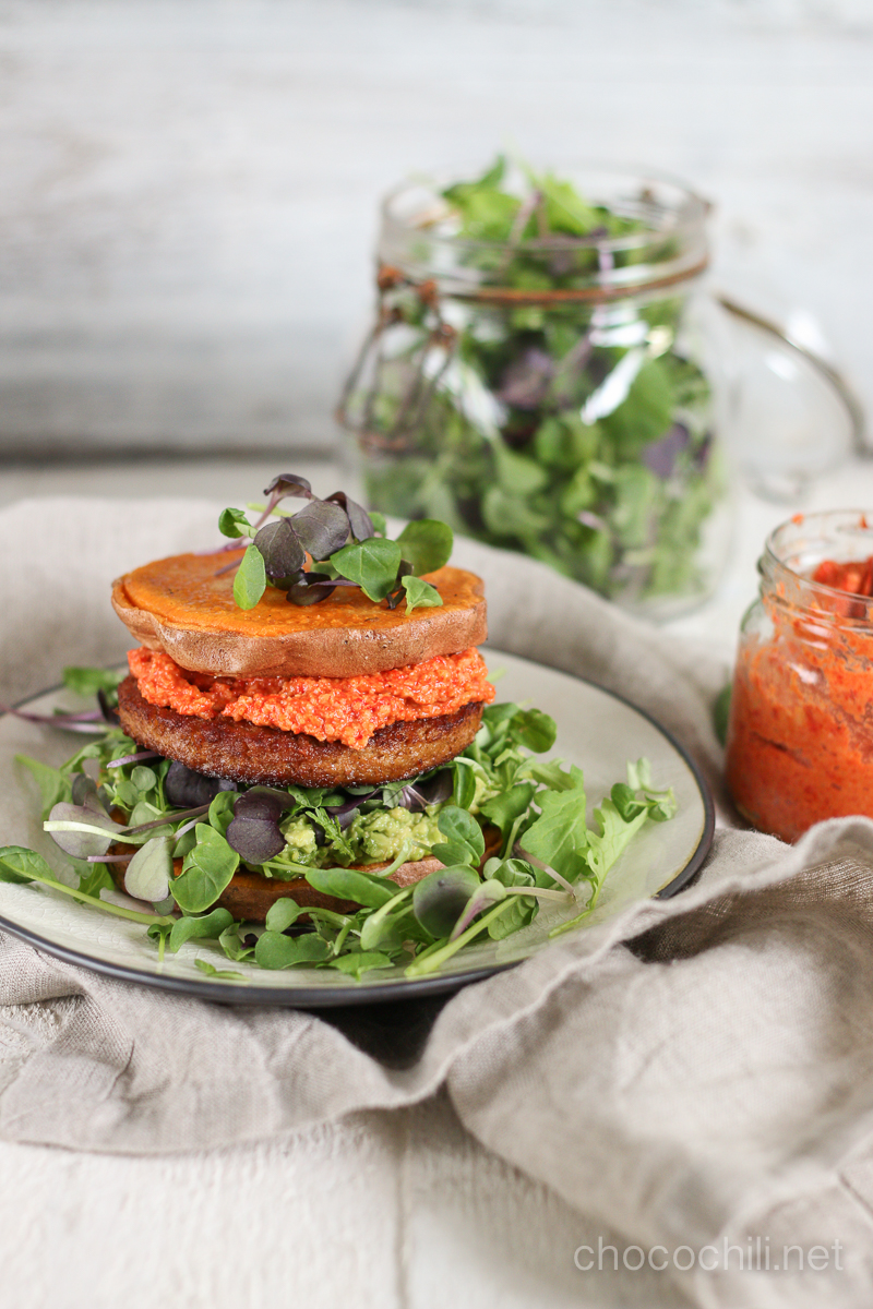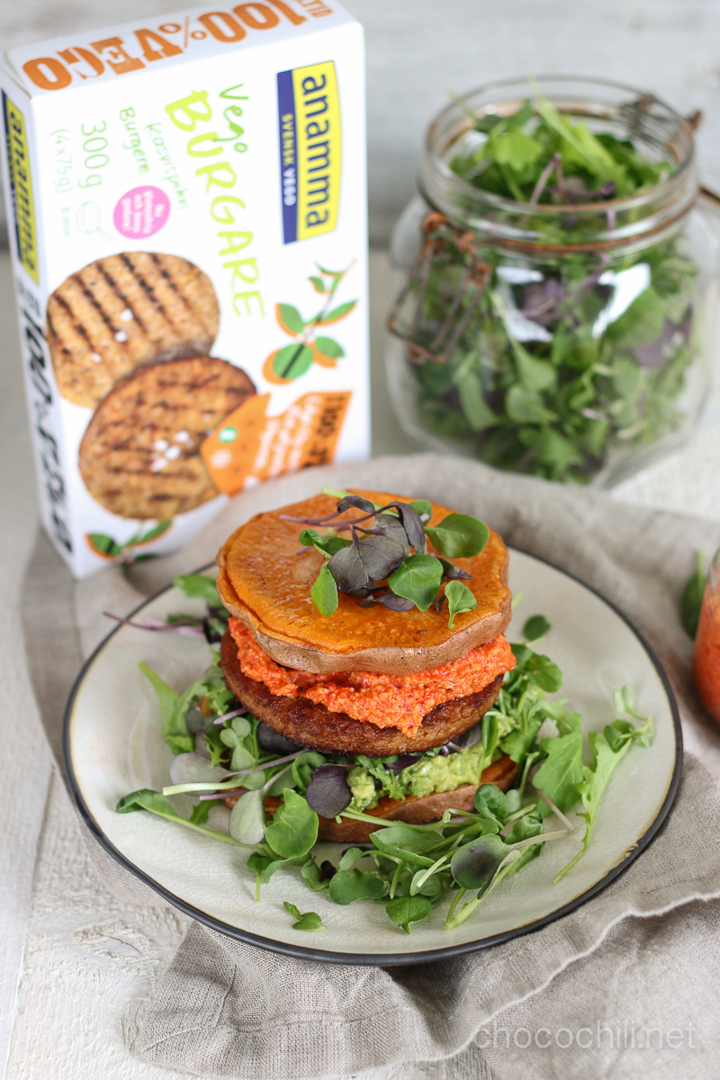 Yhteistyössä Anamma – Vegepihvillä ja paahdetuista paprikoista tehdyllä tahnalla täytetyt bataattiburgerit ovat täydellistä vaikkapa pääsiäispöydässä!