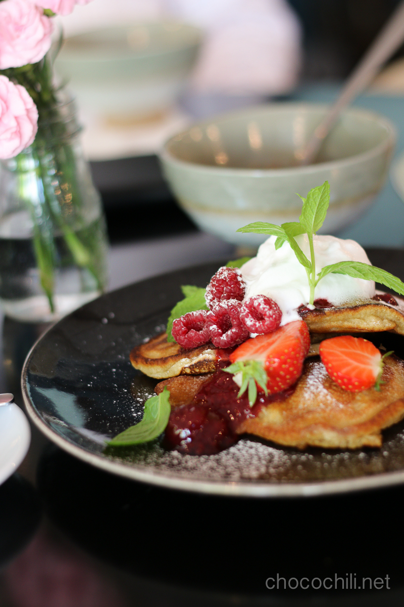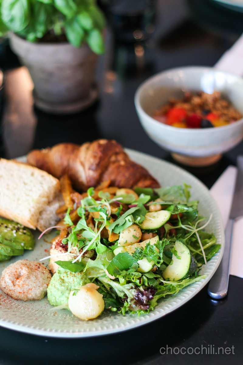 Kuoren vegaaninen aamiaislautanen (16€) sisälsi täysjyväcroissantin, leipää, erilaisia tahnoja, avokadoa, salaattia ja soijashawarmaa sekä smoothiekulhon myslillä ja marjoilla. Lisämaksusta saa myös pannukakkuja (niitä emme tietenkään jättäneet väliin), kuohuvaa ja erikoiskahveja.
