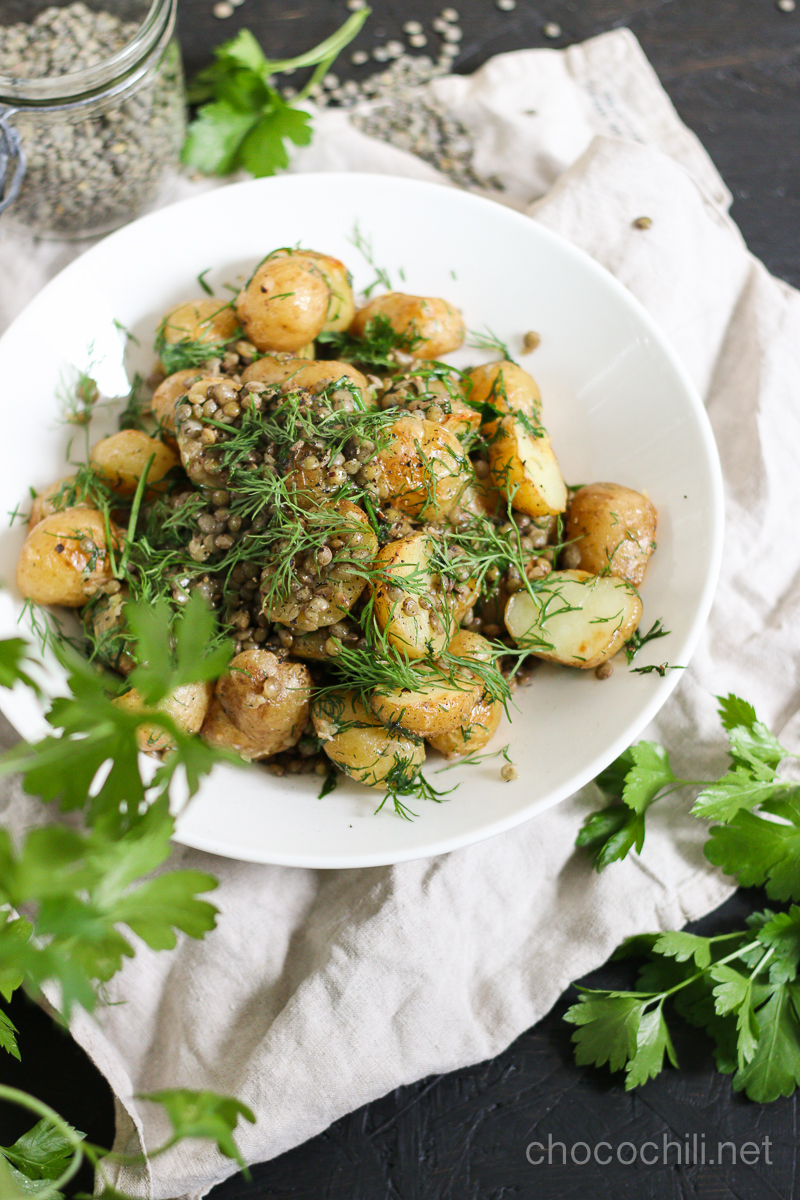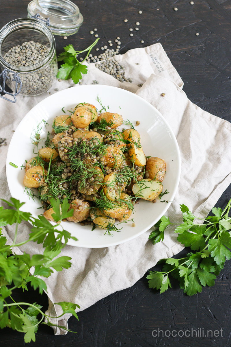 Uusista perunoista ei vaan saa tarpeekseen tähän vuodenaikaan. Olen viime viikot mussuttanut uusia perunoita niin keitettynä, grillattuna kuin uunissa paahdettunakin. Kaikin tavoin yhtä hyvää! Tänään heitin uudet perunat uuniin ja tein niistä ihanan lämpimän salaatin ranskalaisten linssien, sitruuna-öljykastikkeen sekä tuoreiden yrttien kanssa. Supersimppeliä ja niin hyvää!