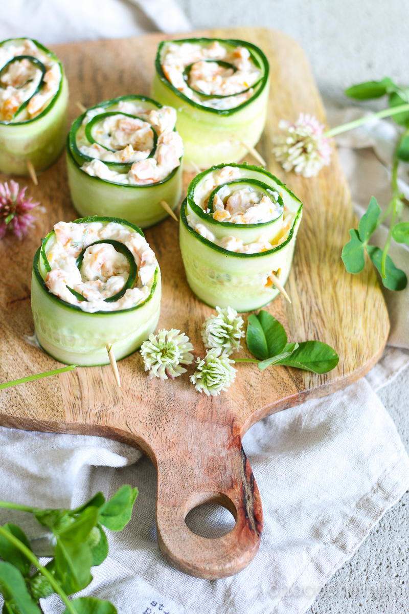 Kotimaiset kurkut ovat nyt sesongissa ja edullisia, joten olen yrittänyt keksiä niille muutakin käyttöä kuin perinteisesti salaatin joukossa. Kurkuista syntyy myös astetta fiinimmän näköistä syötävää! Nämä helppotekoiset porkkalalla ja vegaanisella tuorejuustolla täytetyt kurkkurullat ovat ihanaa naposteltavaa esimerkiksi kuohuviinin kanssa.