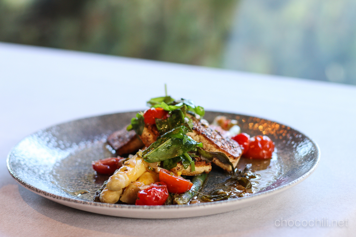 Pääruoaksi tarjoiltiin vihreää ja valkoista parsaa, paahdettuja tomaatteja, yrttejä ja rapeaksi paistettua tofua.
