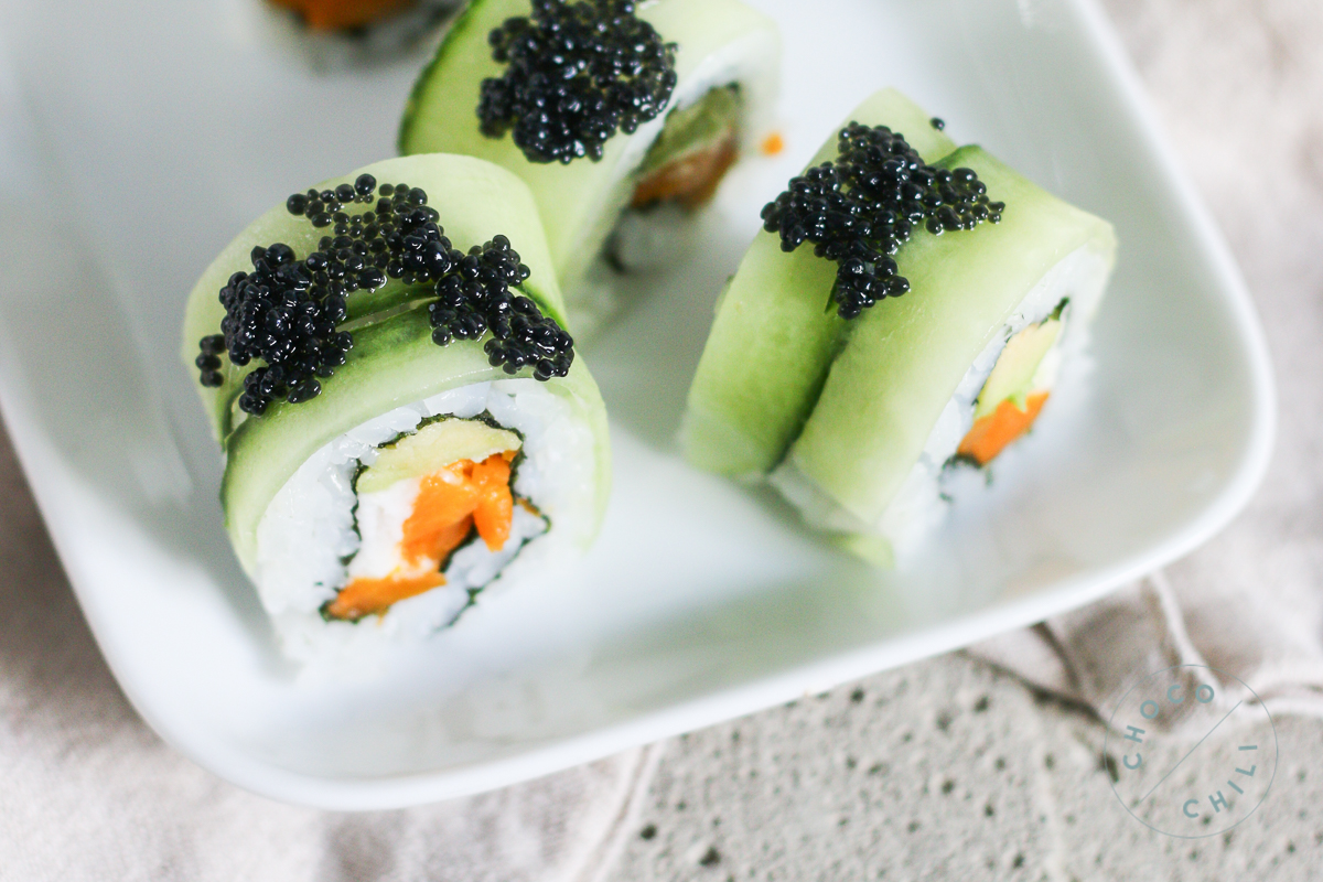 Näiden makirullien sisällä on porkkalaa ja vegaanista tuorejuustoa. Koko komeus on koristeltu kurkulla ja merileväkaviaarilla.