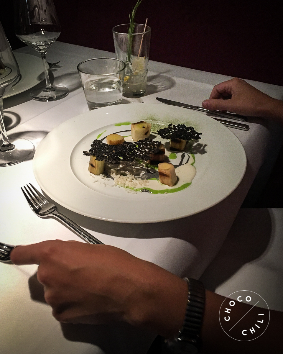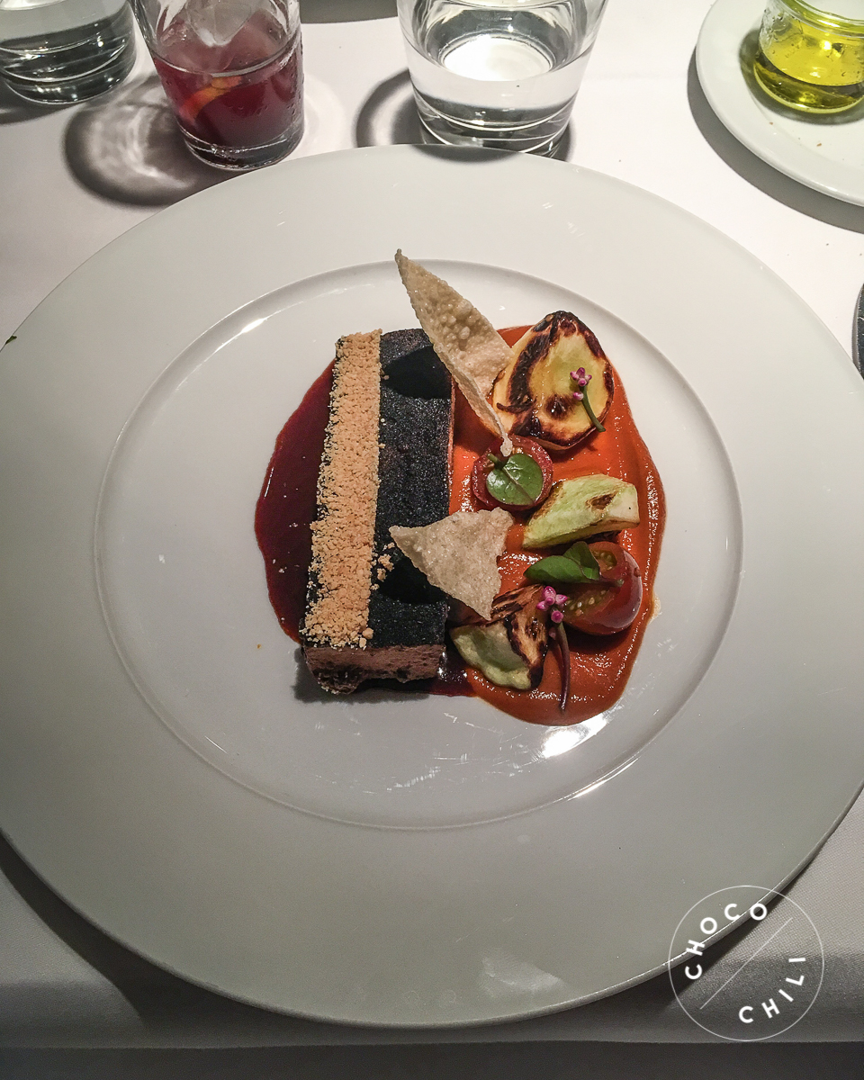 Alkuruoan (kuvassa yllä) kohdalla meinasi iskeä jo heti pieni epätoivo. Grillattujen purjojen paras olomuoto ei mielestäni ole jääkaappikylmä. Kuori oli aavistuksen sitkeä ja kaikki annoksen kastikkeet olivat todella epämiellyttävän makuisia. Pahinta oli kuitenkin tuo mustista seesaminsiemenistä tehty keksi, joka oli poltettu aivan karrelle. Palaneen maku oli suussa vielä illallakin. Tavallisesti pidän monista paahteisen, kitkerän ja hieman pistävän makuisista ruoista, kuten tahinista ja piparjuuresta, mutta tässä annoksessa näitä kaikkia oli yhdistelty niin, että lopputulos ei ollut ollenkaan tasapainoinen eikä missään nimessä mitenkään miellyttävä. Ruoka jäi meiltä kaikilta syömättä ja saimme annokset ilmaiseksi.