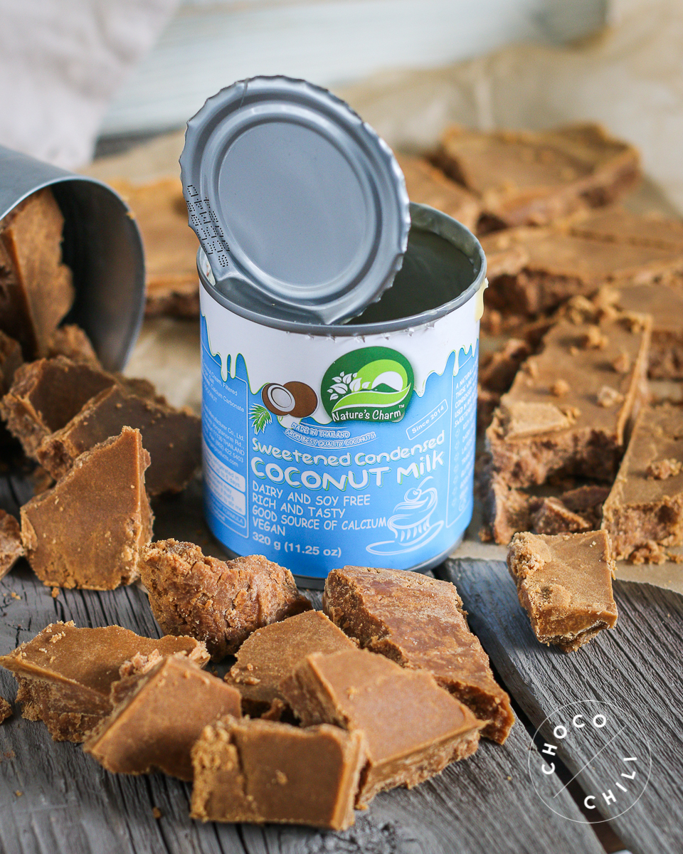 Vegaaninen fudge valmistuu kondensoidusta kookosmaidosta. Nam!