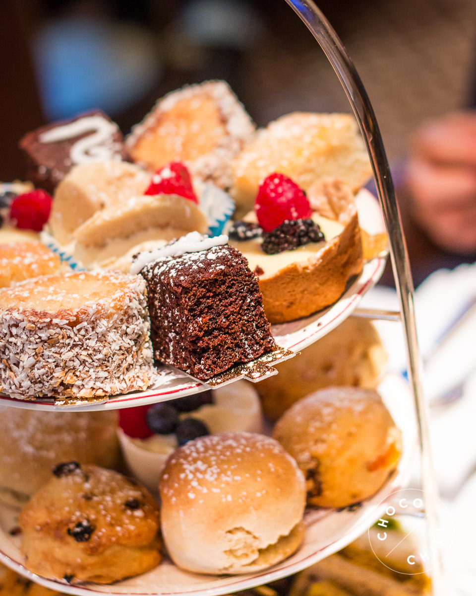 Kerrosvadin yli kerros notkui erilaisia leivoksia. Täydellisen mehevä ja kostea sitruunakakku oli meidän lempparimme, mutta myös suklaabrownie ja vaniljakastikkeella täytetty leivos hävisivät nopeasti parempiin suihin. Kookoksen ystäviä (eli tässä seurueessa minua) hemmoteltiin mehevällä kookos-kaakaoleivoksella.