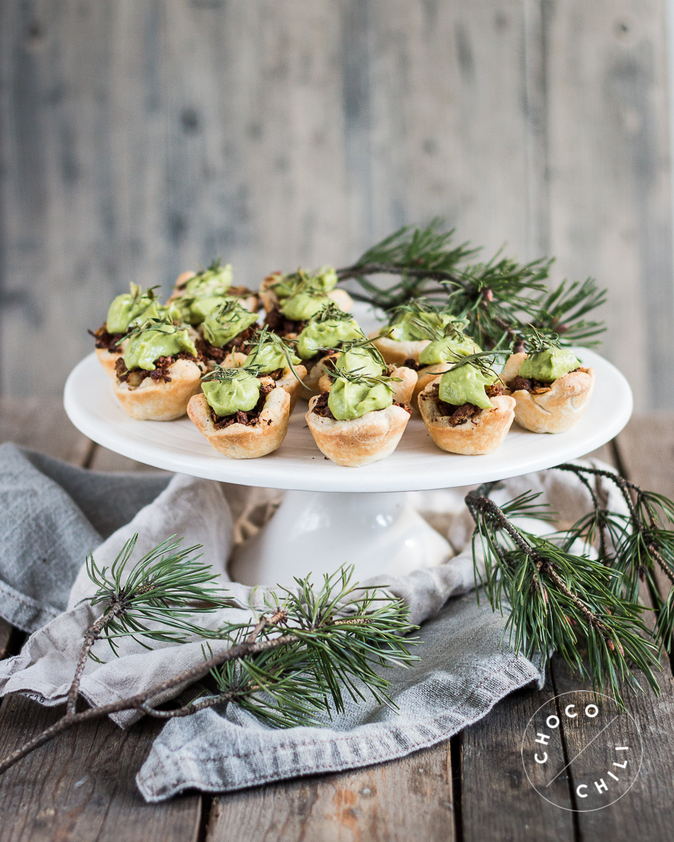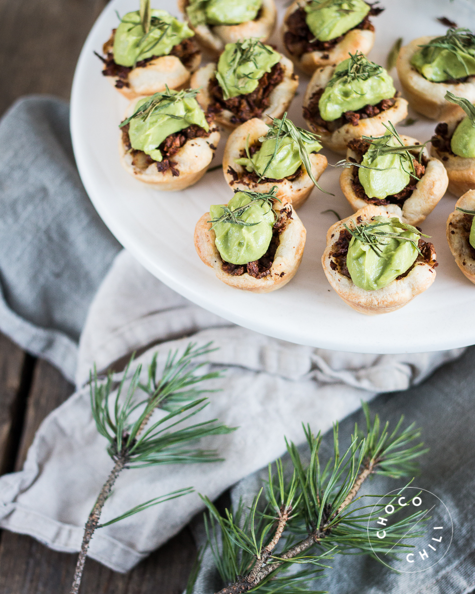 - Tee avokadotahna suupalojen päälle vasta hetki ennen tarjoilua: soseuta avokadot ja sitruunamehu sauvasekoittimella tasaiseksi tahnaksi. Lisää mausteet. Lusikoi tahna lehtitaikinakuppien päälle ja koristele haluamallasi tavalla.