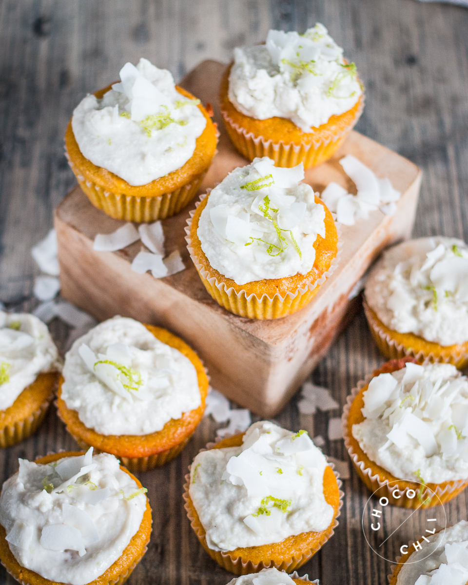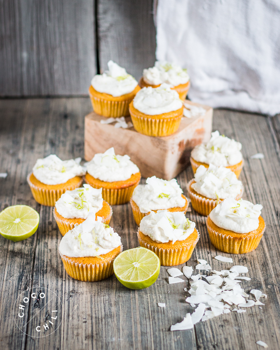 - Levitä kuorrute kuppikakkujen päälle ja koristele kookoslastuilla ja limen kuorella.