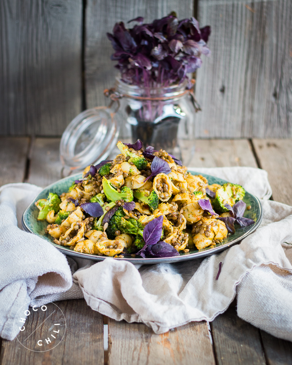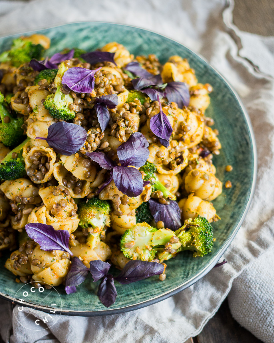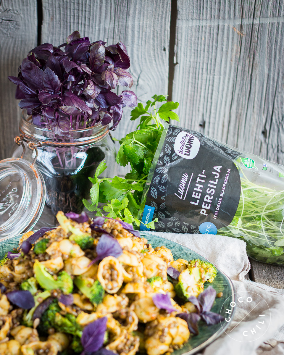 - Sekoita yhteen pasta ja pesto. Lisää linssit, parsakaalit ja auringonkukansiemenet. Tarkista suola. Viimeistele salaatti lopuksi punaisella basilikalla.