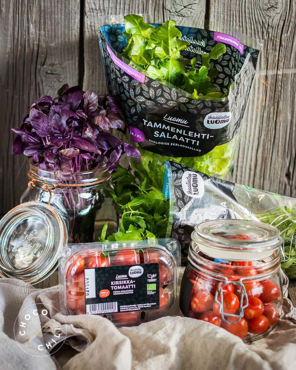 Minulle on myös tärkeää, että tiedän missä ruokani on tuotettu. Kasvihuonevihannesten syöminen keskellä talvea ei ehkä ole kaikkein ekologisin ratkaisu, mutta jos sinäkään et halua järsiä koko talvea jäisiä nauriita, niin voi valita paremmat tuotantomenetelmät: Ikaalisten luomun vihannekset ja yrtit kasvavat Ikaalisissa ja Honkajoella pääosin maakaasulla ja biohakkeella täysin kierrätettävissä kasvualustoissa. Pidän siitä, että tuotantomenetelmät on avattu kuluttajille läpinäkyvästi. Tarkemmin Ikaalisten luomusta voi lukea heidän nettisivuiltaan. Tuotteiden maku on kuitenkin aina pääasia, enkä muista ihan hetkeen syöneeni yhtä mehevää persiljaa tai makeita tomaatteja tähän aikaan vuodesta.