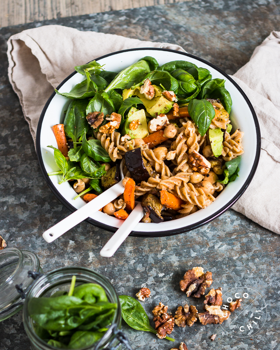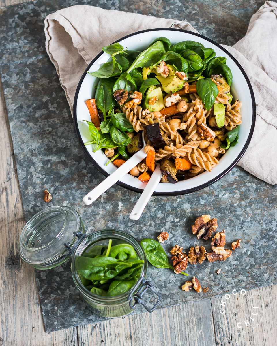 En ole viime aikoina saanut tarpeekseni kahdesta asiasta: munakoisosta ja pastasalaateista. Tänään päätinkin yhdistää nämä kaksi asiaa. Uunissa peston kanssa paahdetut munakoisot ja porkkanat ovat mainio lisä talviseen pastasalaattiin.