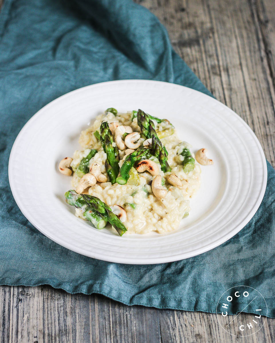 4. Kuumenna kattilassa ruokalusikallinen öljyä. Lisää riisi ja kuullota hetki. Kaada sitten kasvislientä kattilaan vähän kerrallaan sitä mukaa, kun se imeytyy riisiin. Keitä risottoa keskilämmöllä, kunnes kasvisliemi on imeytynyt (noin 15 minuuttia). Lisää kattilaan vielä valkoviini ja anna imeytyä. Sekoita kattilaan lopuksi cashewkerma, ravintohiivahiutaleet ja parsa-sipuliseos (säästä parsan nuput koristeluun). Tarkista suola.