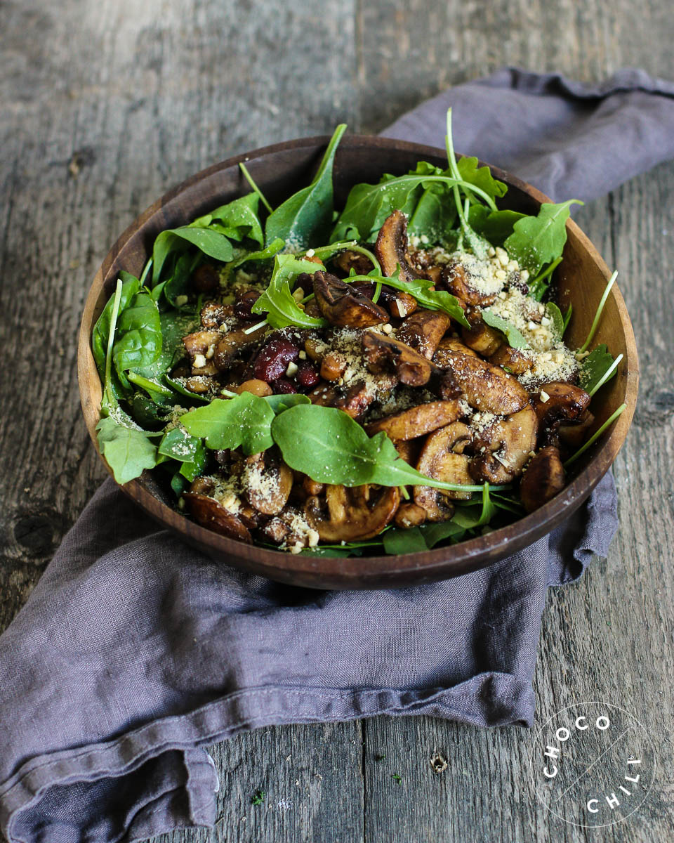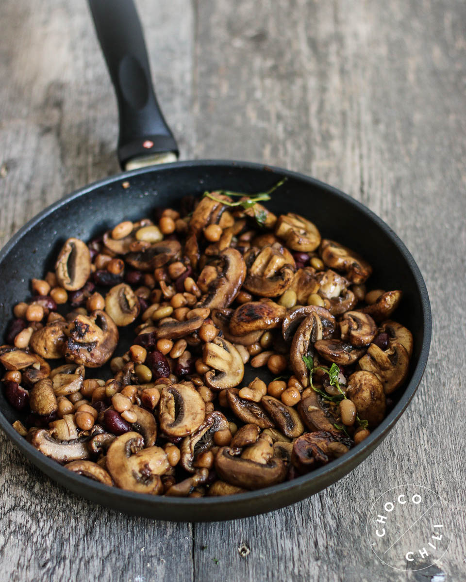 Terveisiä jouluruokatehtaalta! Vegaanin joulukirjan parissa pakertaminen on täällä täydessä vauhdissa, mutta välillä on ihan pakko saada syödäkseen jotain muutakin kuin jouluruokia. Tänään pyöräytin tällaisen nopean ja tosi hyvän lämpimän salaatin sienistä ja pavuista. Oiva lounas tuoreen maalaiseivän kanssa!