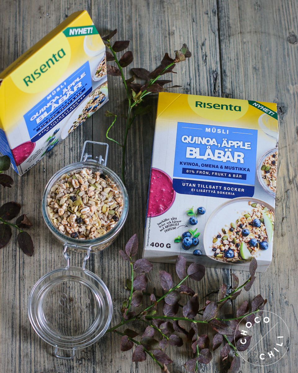 - 2 dl Risenta kvinoa, omena & mustikka -mysliä