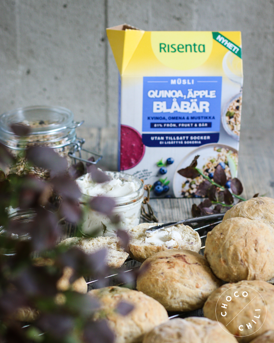 Risentan uusi mysli kvinoa, omena & mustikka löytyy kaupoista syyskuussa, mutta pääsin testailemaan sitä jo ennakkoon. Olen mutustellut tätä sokeritonta, runsaasti siemeniä, hedelmiä ja marjoja sisältävää mysliä pääasiassa soijarahkan kanssa aamupalalla, mutta se upposi aivan loistavasti myös sämpylätaikinan joukkoon.