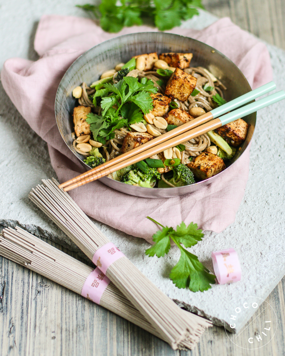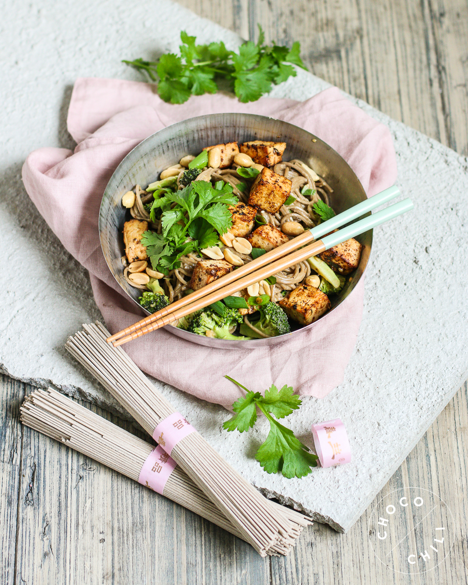 Lämmin sobanuudelisalaatti tofulla, parsakaalilla ja tuhdilla maapähkinäkastikkeella.
