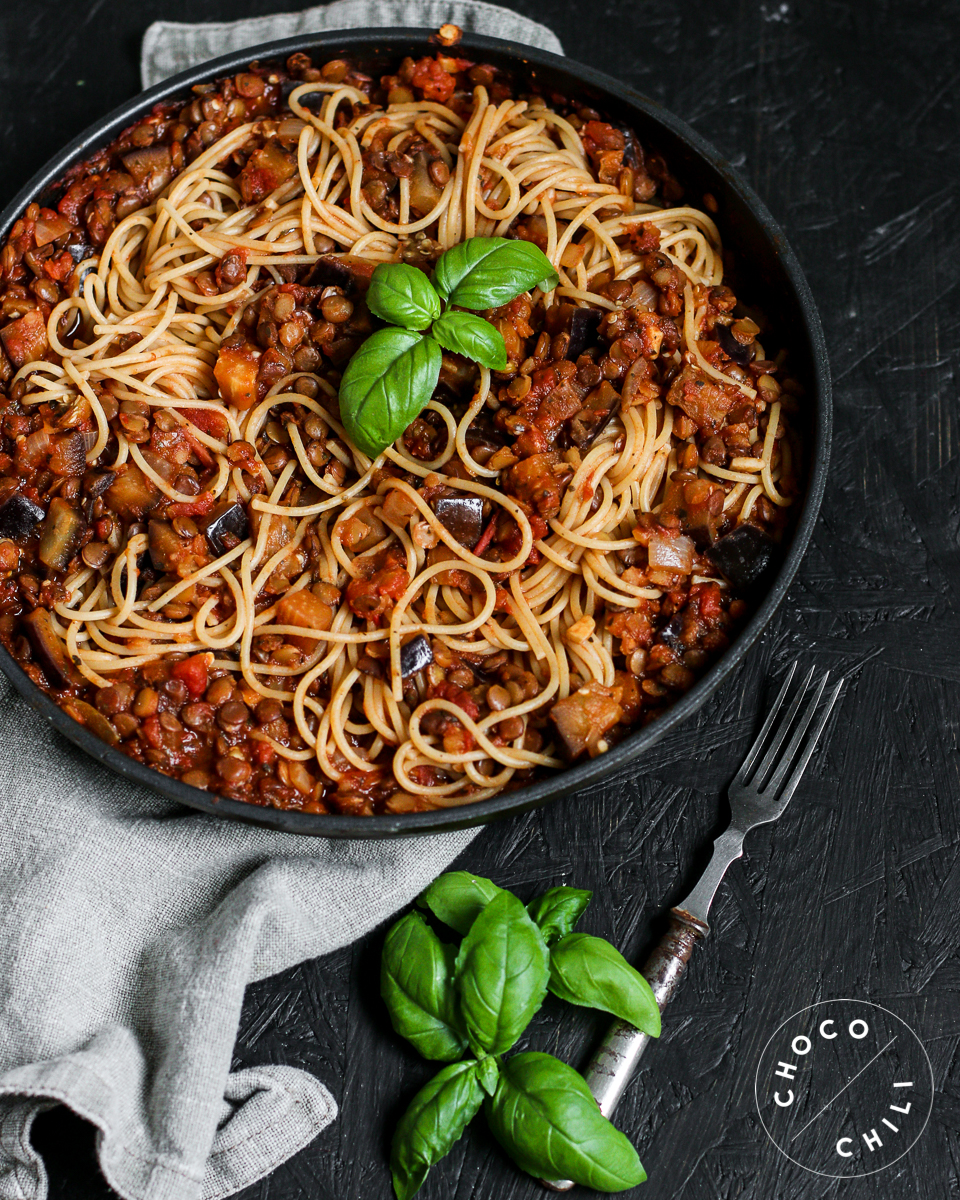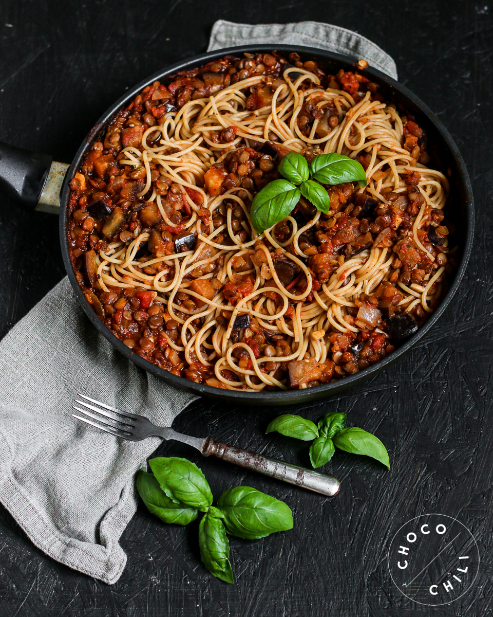 Helppo ja tuhti kasvisbolognese valmistuu munakoisosta ja linsseistä.