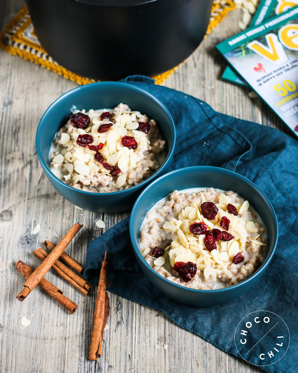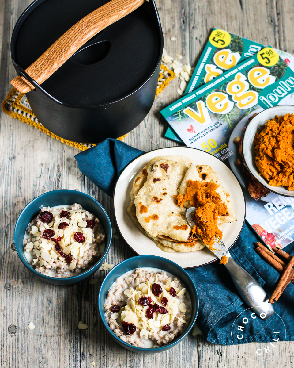 Olen lähdössä ensi viikolla kuukaudeksi ulkomaille, joten nyt on viimeiset hetket fiilistellä jouluruokien parissa ennen lähtöä. Kokkailin Vege Joulu -lehden ohjeilla herkkuaamiaisen, johon kuului mantelimaitoon keitettyä  ohrapuuroa ihanalla mantelisilmällä, helppoja pannulla paistettavia seesamileipiä ja superhyvää porkkanavoita jouluisilla mausteilla.