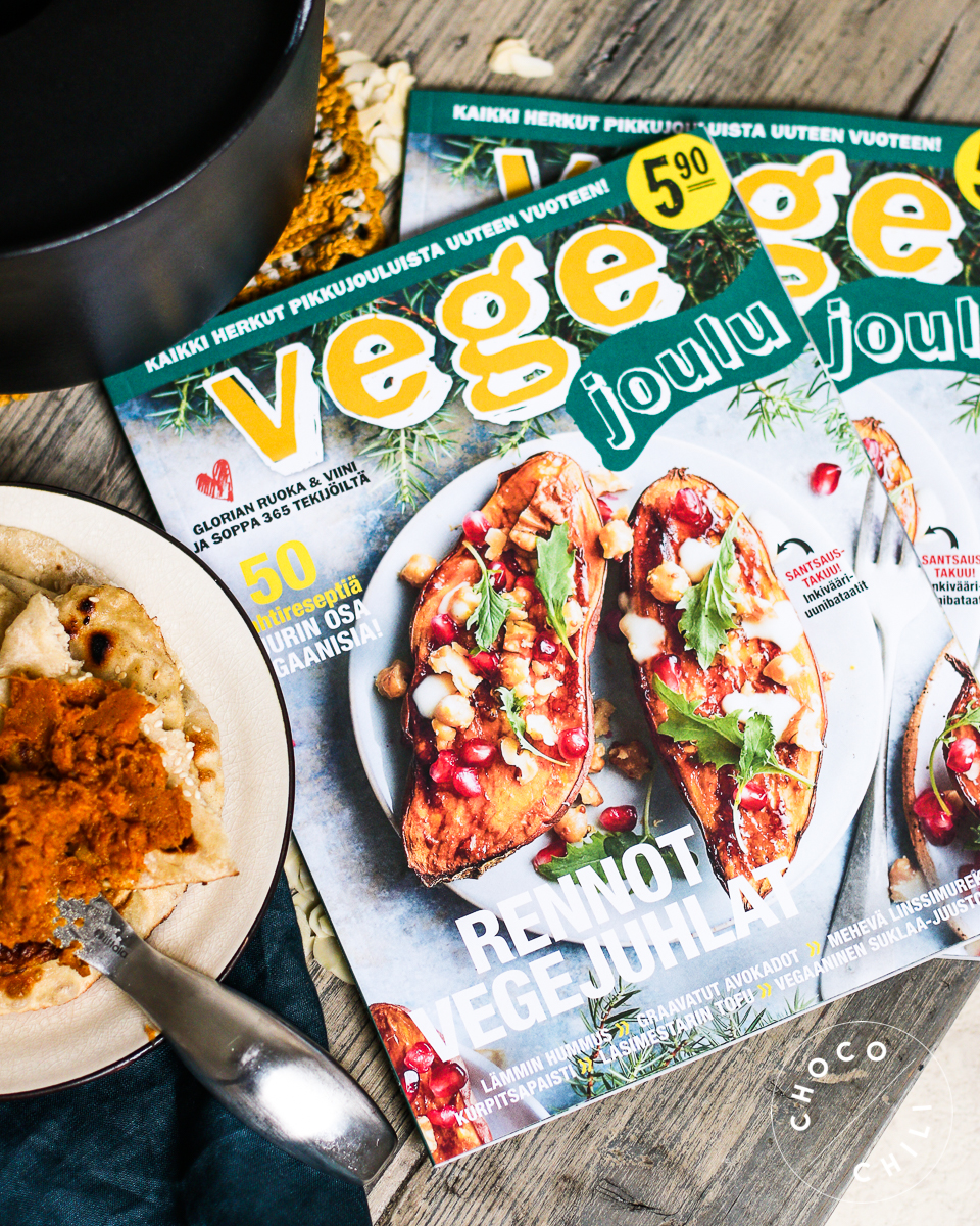 Vegaanisista jouluherkuista innostuvia hemmotellaan tänä jouluna! Kirjakaupoissa on nyt myynnissä minun tekemäni Vegaanin joulukirja, mutta ruokakaupastakin voi bongata samalla reissulla hyviä joulureseptejä! Soppa356-sivuston ja Glorian Ruoka & Viini -lehden tekijöiltä on tullut uusi Vege Joulu -lehti, joka on täynnä ihania jouluun ja koko talveen sopivia kasvisreseptejä.