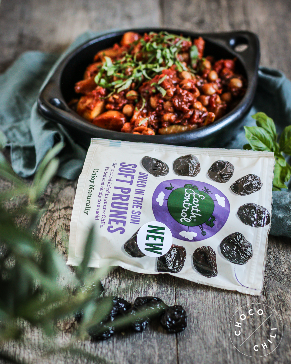 Tämä mausteinen pata sopii mainiosti muuten vaikka isänpäivän päivälliselle! Pata saa makunsa paitsi erilaisista kasviksista, myös appelsiinista, punaviinistä,  pohjoisafrikkalaisesta Ras el hanout -mausteseoksesta sekä makeista luumuista, jotka tuovat pataan mehevyyttä. En ollutkaan pitkään aikaan syönyt kuivattuja luumuja, mutta taisin napostella tuon pussin lopun aika pian parempiin suihin tämän reseptin valmistamisen jälkeen! Earth Controlin aurinkokuivatut luumut olivat kyllä ihan supermakeita ja meheviä, tykkäsin! Earth Controlin Facebook-sivut kannattaa muuten laittaa seurantaa, sillä siellä on usein jaossa hyviä reseptivinkkejä.