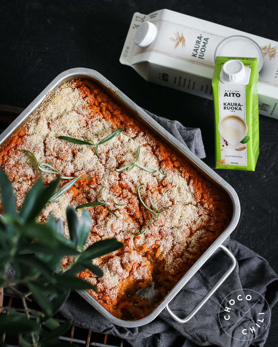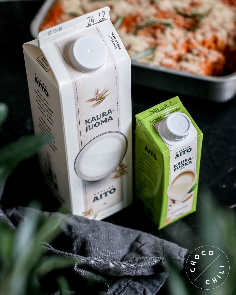 Tämä porkkanalaatikko on esiintynyt tällä tontilla aikaisemminkin ja se löytyy myös lokakuussa ilmestyneen Vegaanin joulukirjan kansien välistä. Mutta tämä laatikko on minusta juuri sellainen kuin porkkanalaatikon kuulu olla: sopivan makea, kermaisen täyteläinen ja siinä maistuu valkopippuri ja muskottipähkinä. En valmista porkkanalaatikko koskaan ilman kaurakermaa, sillä se tuo laatikkoon täyteläisyyttä. Riispuurokin keittyy tätä ruokaa varten parhaiten kauramaitoon. Tähän ruokaan täydellisesti sopivat tuotteet olen löytänyt Kaslink Aito -tuotteista, jotka valmistetaan Suomessa kotimaisesta kaurasta. Tuorekauramaidon ja kaurakerman löydät kauppojen kylmähyllystä. Ekologinen kokkailija voi halutessaan vaihtaa vielä laatikon riisin kotimaiseen ohraan, niin tämä herkku valmistuu täysin lähiruokaperiaatteella!