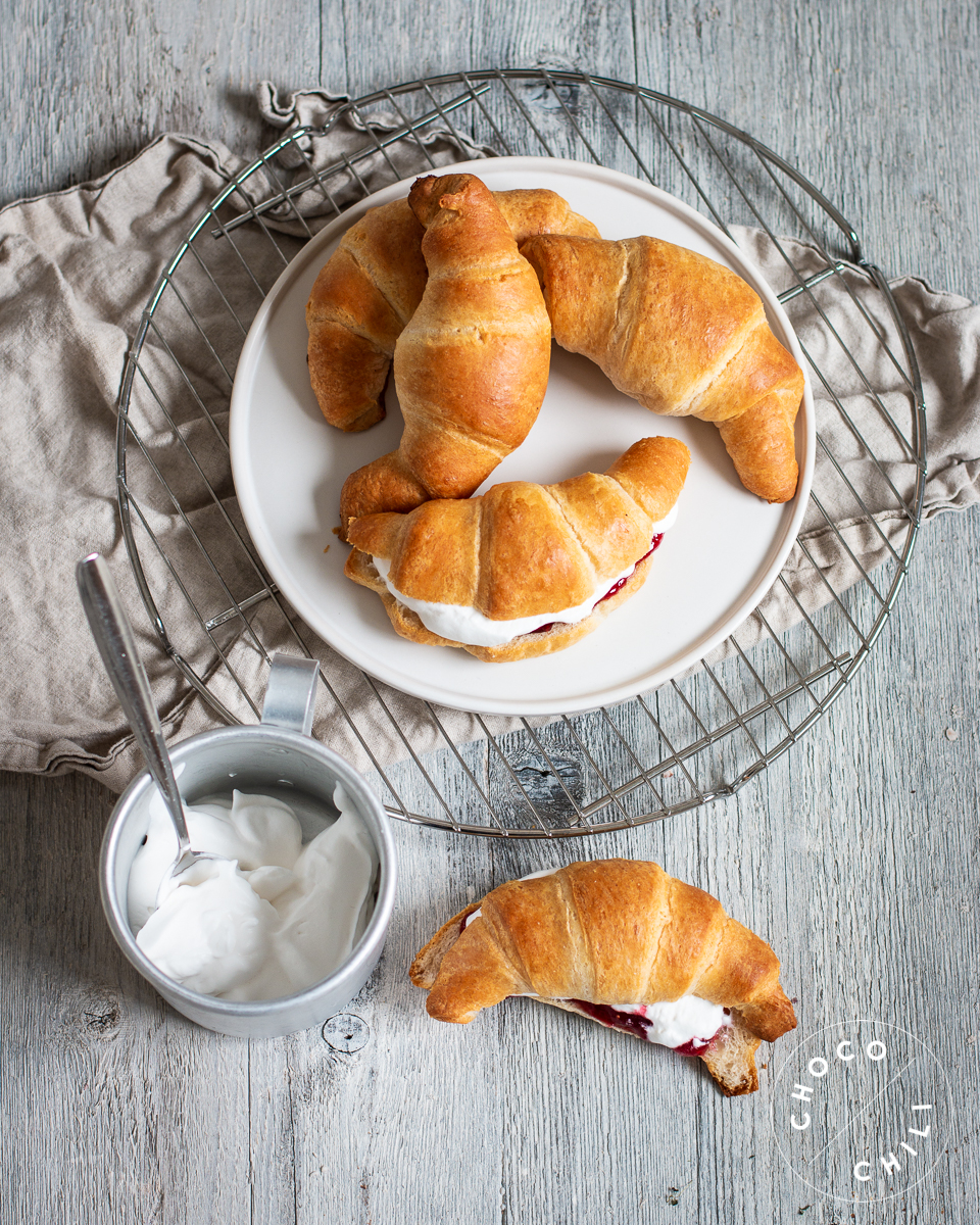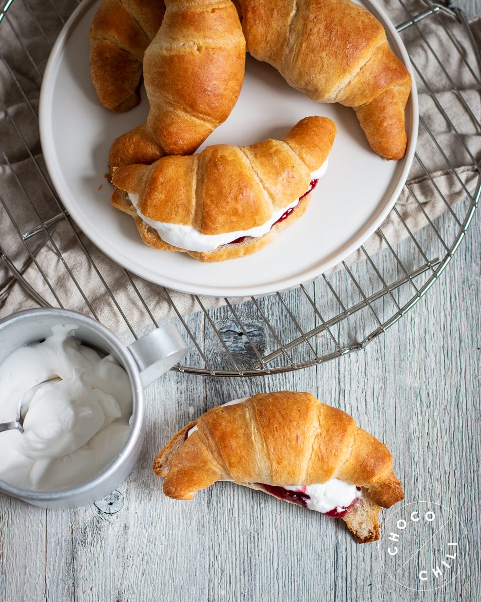 3. Jäähdytä croissantit ja täytä ne hillolla, mantelimassalla ja kermavaahdolla.