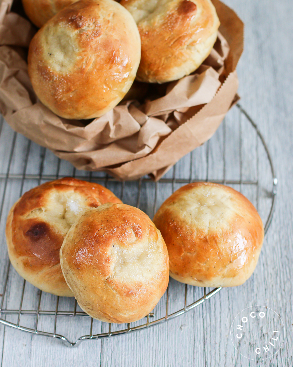 - Vaivaa taikina kiinteäksi palloksi. Muotoile taikina sitten pötköksi ja leikkaa se paloiksi. Pyörittele pulliksi ja anna jälleen kohota.
