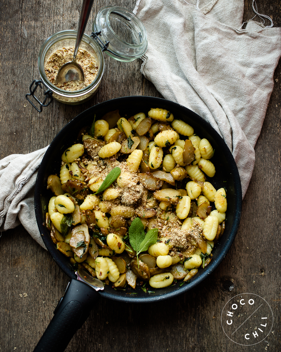 Vinkki! Perunagnocchit löytyvät yleensä kauppojen tuorepastahyllyltä. Gnocchit taitavat olla lähes poikkeuksetta vegaanisia, mutta ainesosalista kannattaa toki tarkistaa kananmunien ja maidon varalta. Ainakin DeCecco-merkkisiä gnoccheja löytyy hyvin isommista K-kaupoista.