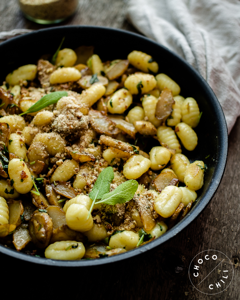 Nyt syksyn saapuessa alkaa taas tehdä mieli kaikkea tuhtia ja rasvaista lohturuokaa, mieluiten sesongin raaka-aineista. Bongasin uusimmasta Viinilehdestä ihanalta kuulostaneen maa-artisokkapastan, jonka muutin vegaaniseksi ja tein ruoan kuivapastan sijaan tuoreista perunagnoccheista. Olen syönyt gnoccheja vähän väliä koko viime kevään ja kesän (esimerkiksi tämän nyhtökaura-gnocchivuoan muodossa), mutta voisin kyllä nyt syksyllä opetella niiden tekemistä myös itse!
